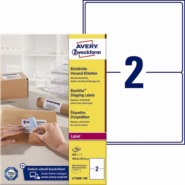 • Ge dina paket och brev en professionell look genom att använda dessa helt vita 100% täckande paketetiketter. Averys L7168B-100 med BlockOut har 2 etiketter/ark och 200 etiketter/fp, och är tillverkade av ett material som döljer gammal text och etiketter samtidigt som det klarar hela resan. De är det perfekta och ekonomiska valet då de 100% täcker gammal text och etiketter så att du enkelt kan återanvända tidigare använd emballage och skicka dina paket med tydlig mottagarinformation. Det gör etiketterna särskilt lämpliga som returetikett i din webbshop när du behöver returnera ett köp som du gjort på en webbshop eller skicka ett paket. Etikettstorleken är särskilt idealisk för paket, rör och lådor. De är kompatibla med alla vanliga svartvita och färglaserskrivare. Den höga papperskvaliteten ger dig vackra och vassa utskrifter. Och Averys JamFREE-garanti säkerställer att du inte behöver oroa dig för att etiketterna fastnar i skrivaren och orsakar stopp. Etiketterna fäster pålitligt och permanent.