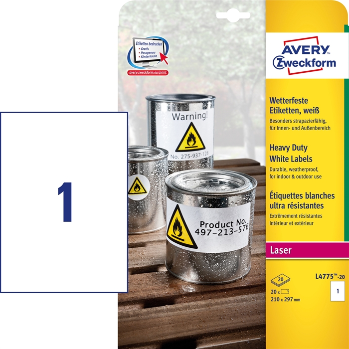 • Extra hållbara och permanent självhäftande etiketter - perfekt för utomhusbruk. Etiketterna är särskilt lämpliga för användning i miljöer som ställer höga krav på hållbarhet, då de är gjorda af slitstarkt polyestermaterial. De är resistenta mot olja, smuts, vatten och UV-strålar. Tål temperaturer från -20 till +80 °C. Etiketterna är lämpliga för af PC-utrustning, fixturer, verktyg och produkter. Etiketterna är lämpliga för laserutskrift. Designa och skriv ut etiketterna med GRATIS Avery online software , som du hittar på www. avery .dk. Etikettformat: 210 x 297 mm. Förpackning om 20 ark x 1 etikett/ark = 20 etiketter/pk.
