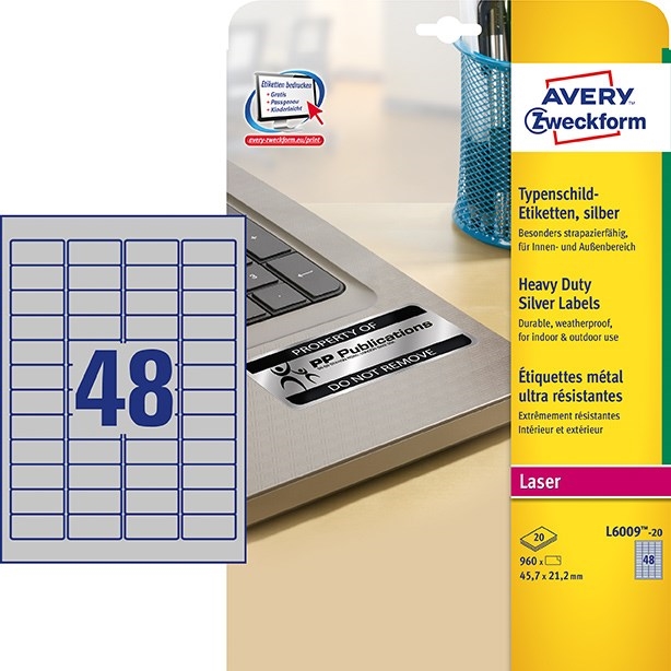 • Extra hållbara och permanent självhäftande etiketter - perfekt för utomhusbruk. Etiketterna är särskilt lämpliga för användning i miljöer som ställer höga krav på hållbarhet, då de är gjorda af slitstarkt polyestermaterial. De är resistenta mot olja, smuts, vatten och UV-strålar. Tål temperaturer från -20 till +80 °C. Etiketterna är lämpliga för af PC-utrustning, fixturer, verktyg och produkter – eller en snygg etikett på en broschyr eller annat marknadsföringsmaterial. Etiketterna är lämpliga för laserutskrift. Designa och skriv ut etiketterna med GRATIS Avery online software , som du hittar på www. avery .dk. Etikettformat: 45,7 x 21,2 mm. Förpackning om 20 ark x 48 etiketter/ark = 960 etiketter/pk.