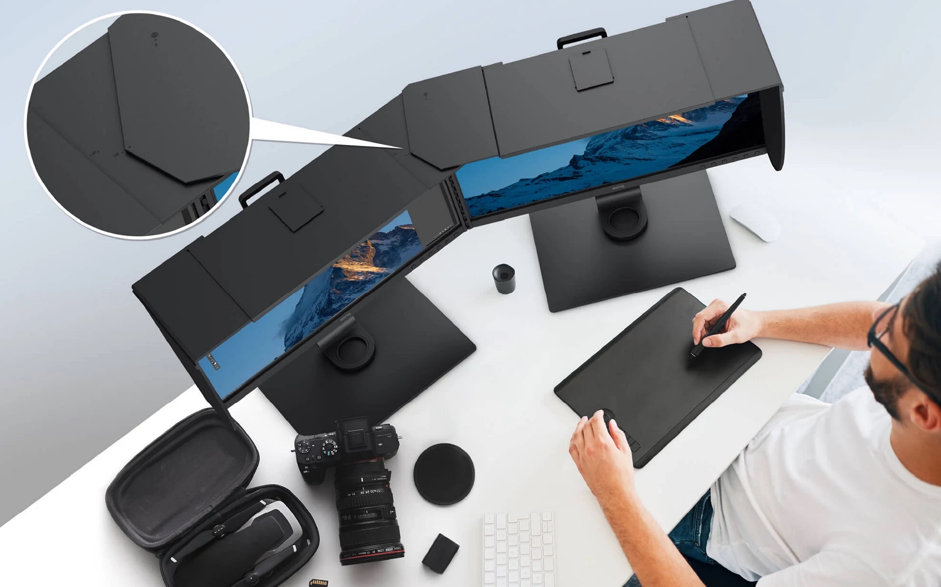 Det finns inte längre ett behov av att välja mellan flera skärmar utan huva och en skärm med huva. Få det bästa av två världar med BenQ HB27 shadow bridge. Bron erbjuder en enkel lösning som ansluts till en eller flera displayer. Fotografer kan retuschera och redigera verk på en multi-monitor-inställning med skuggskärmar på och få ut mer av professionellt kalibrerade, bländfria och icke-reflekterande färgexakta BenQ -skärmar tack vare användningen av skuggskärmar.