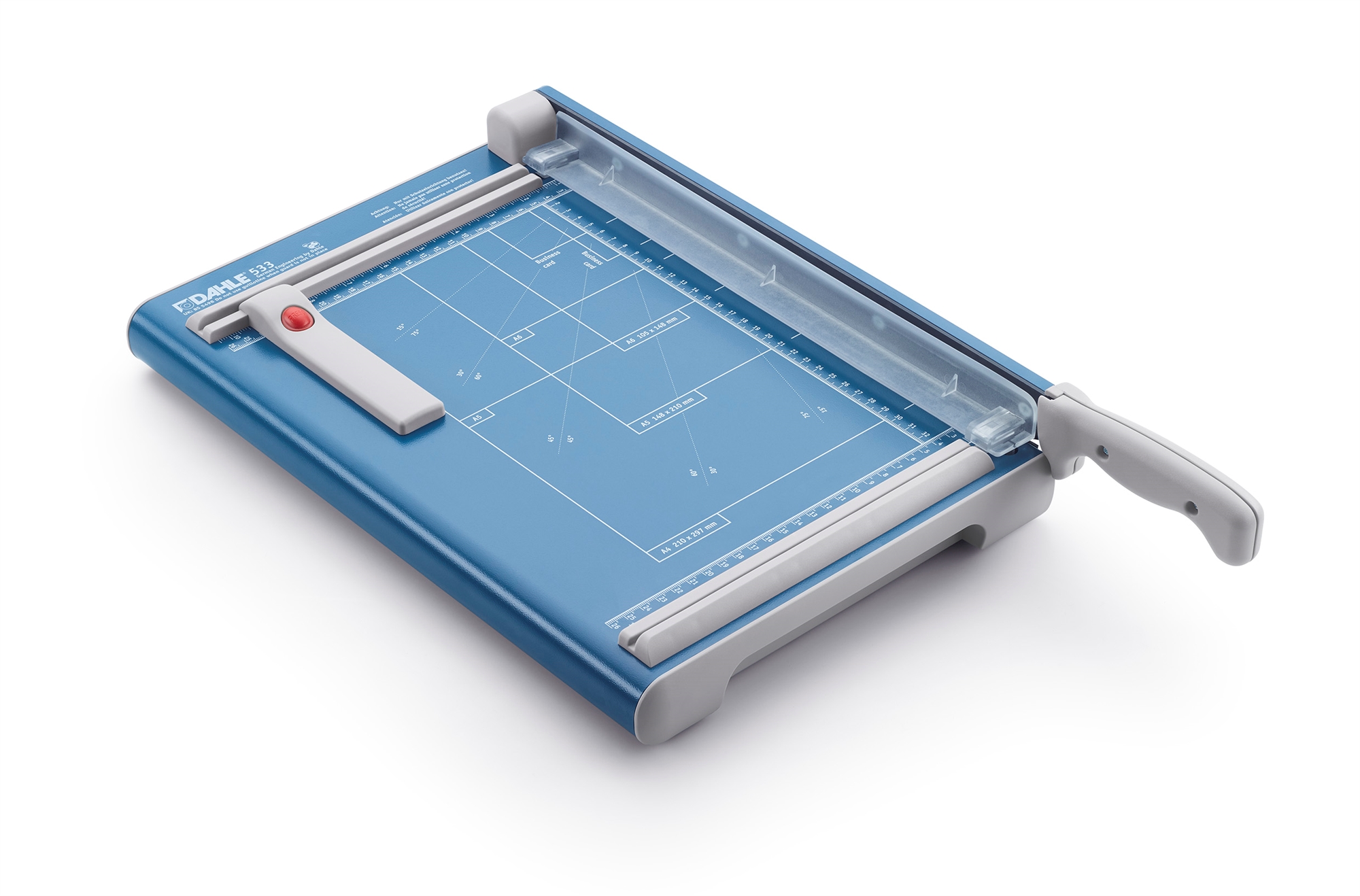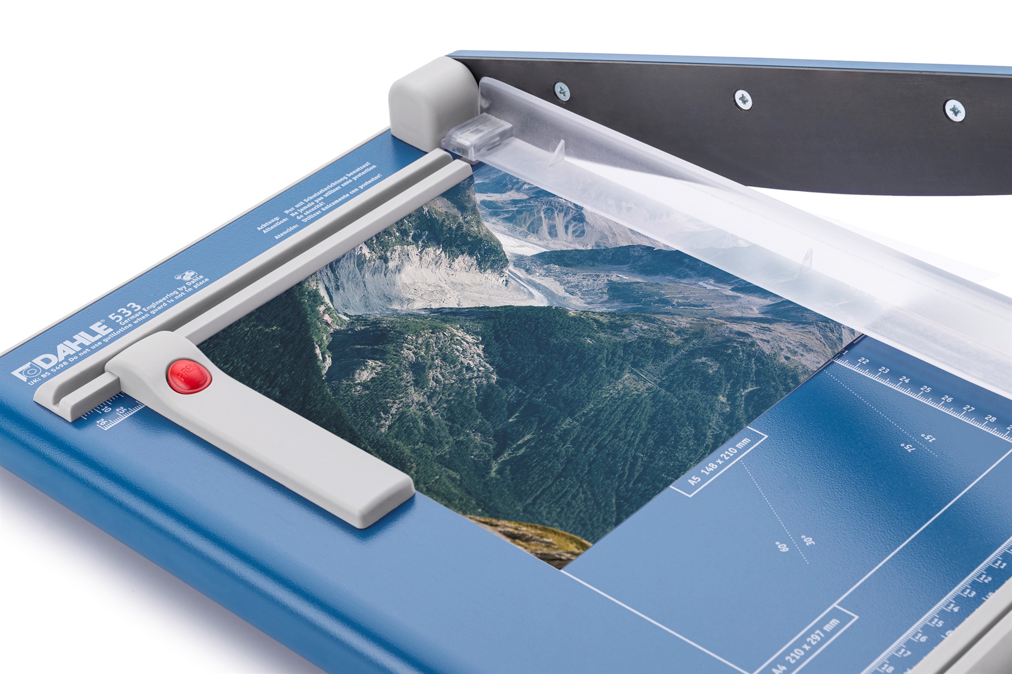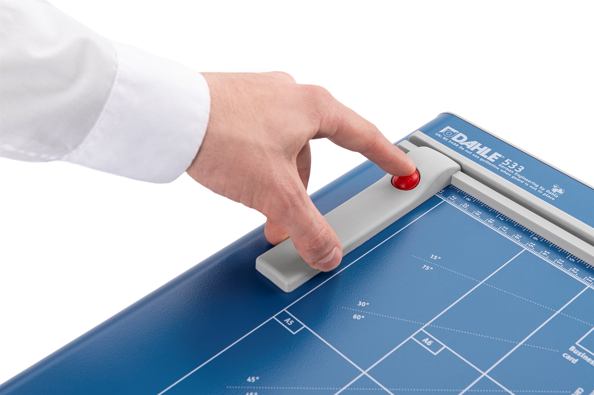 • Dahle 533 är en extremt användarvänlig skärmaskin i giljotin-modell med ett robust metallbord och halkskyddade gummifötter och är perfekt för hobbyanvändning. Infällt handtag för att säkerställa extra säker hantering.