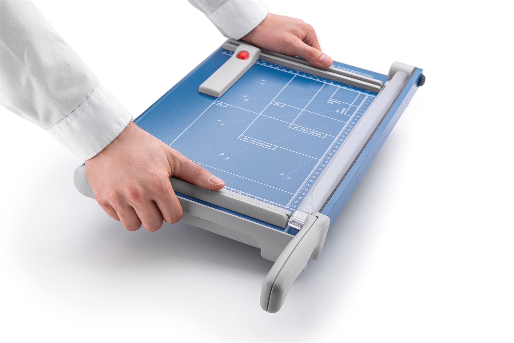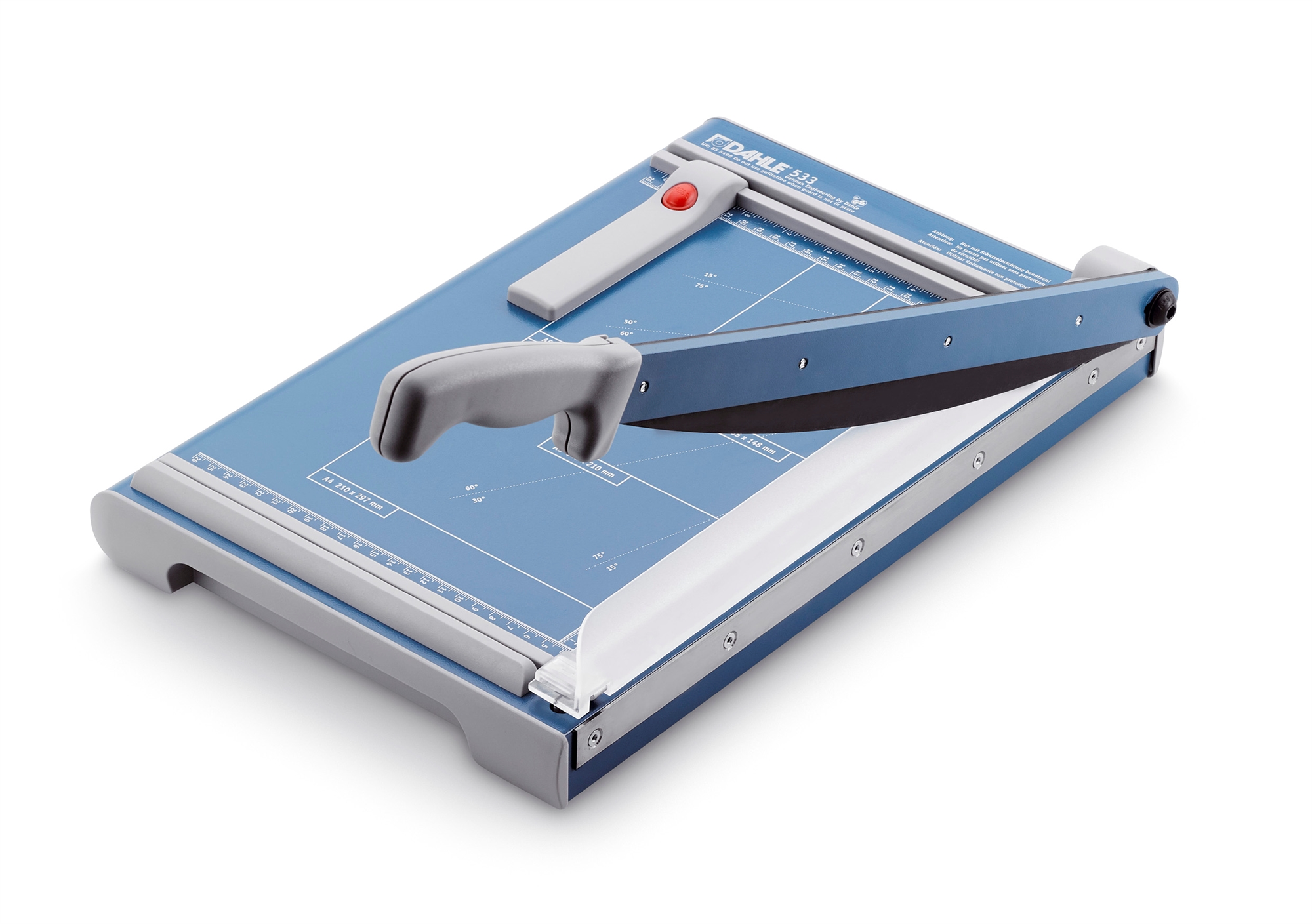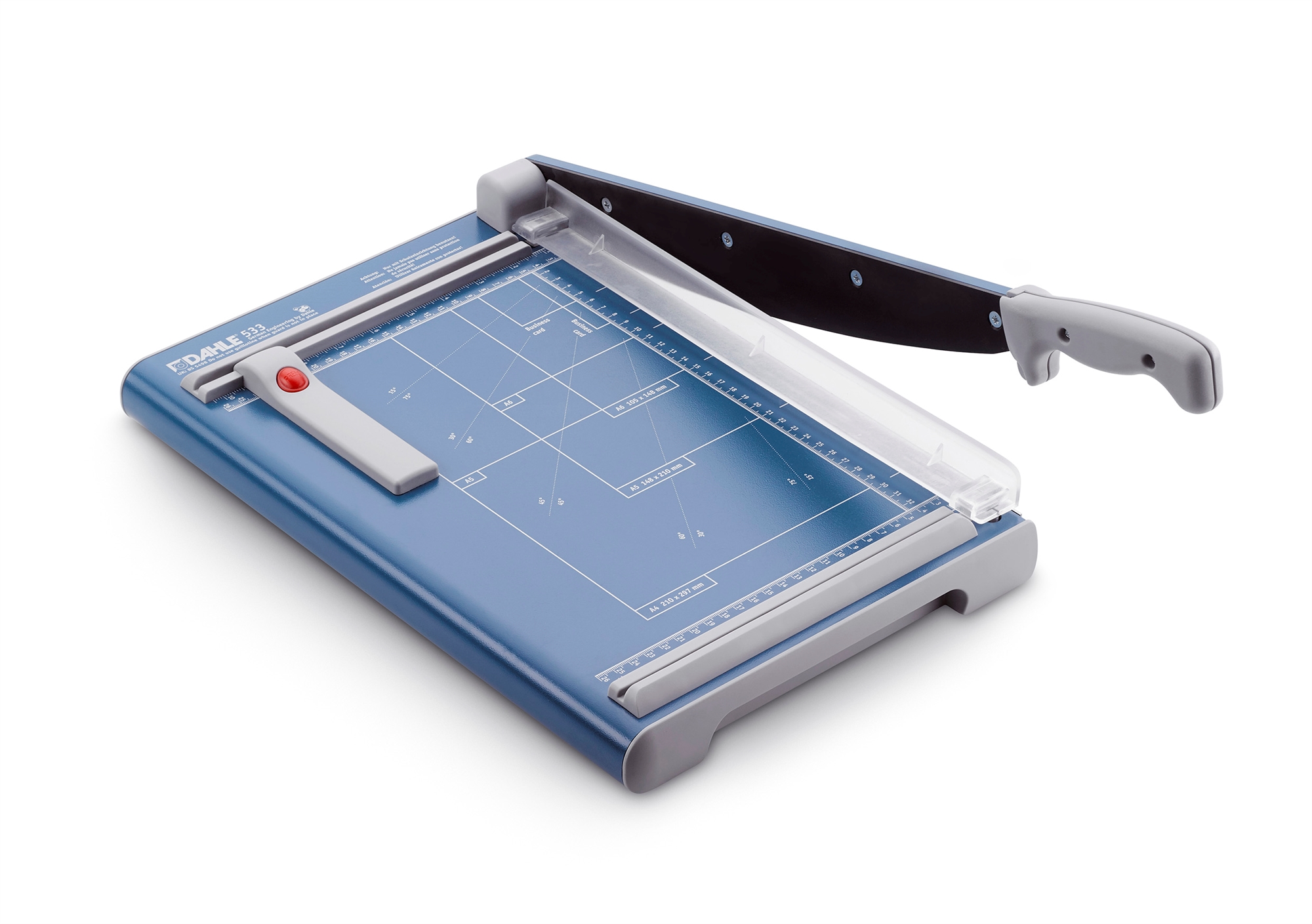 • Dahle 533 är en extremt användarvänlig skärmaskin i giljotin-modell med ett robust metallbord och halkskyddade gummifötter och är perfekt för hobbyanvändning. Infällt handtag för att säkerställa extra säker hantering.