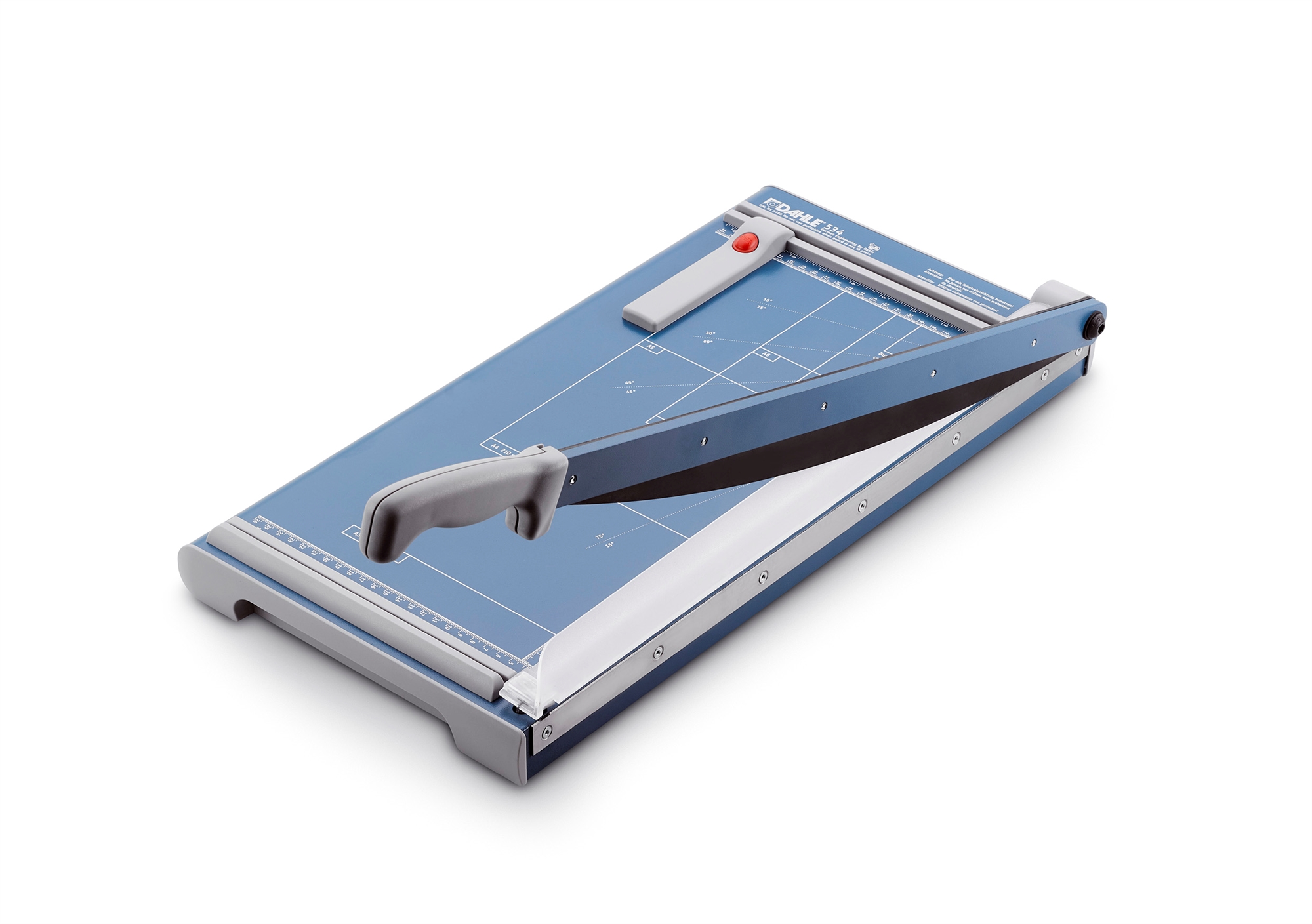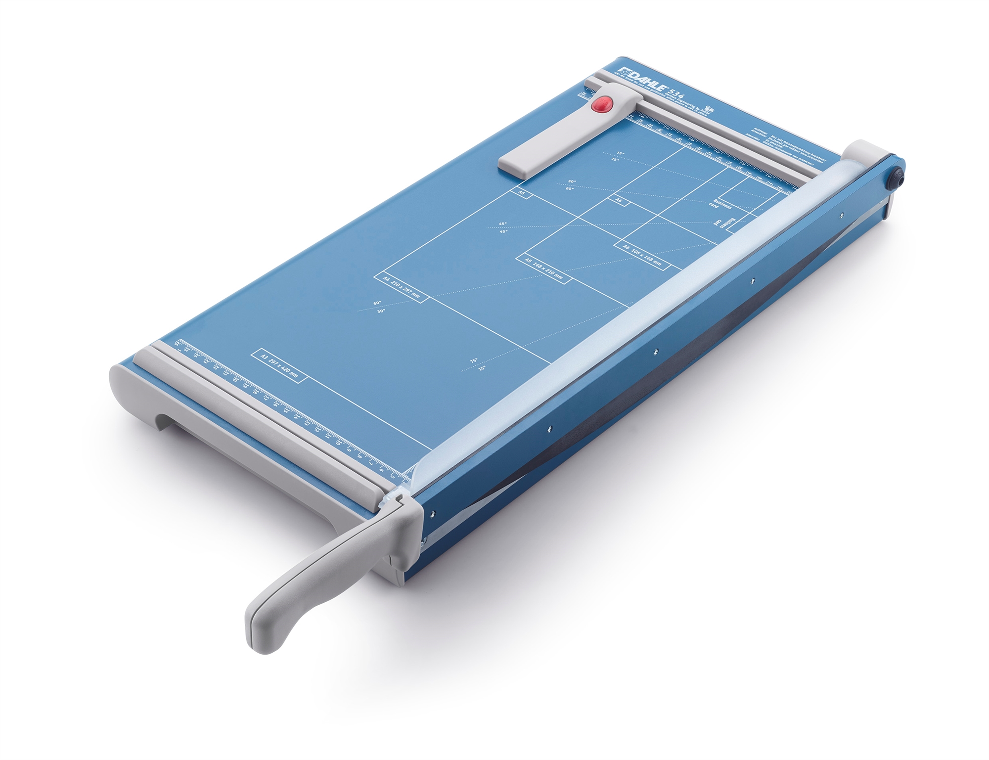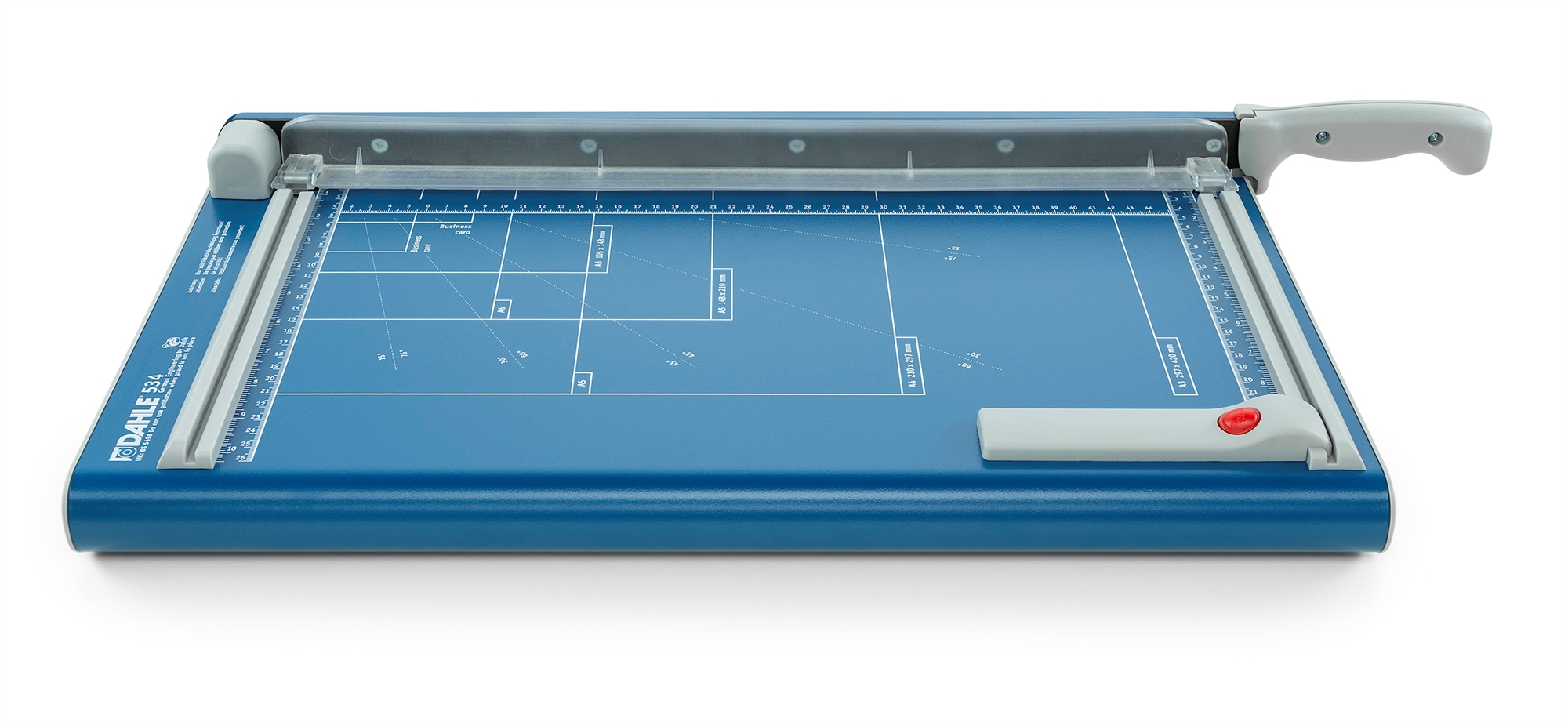 • Dahle 560 är en extremt användarvänlig skärmaskin i giljotin-modell med ett robust metallbord och halkskyddade gummifötter och är perfekt för hobbyanvändning. Denna högkvalitativa skärmaskin levereras med ett ergonomiskt format handtag på ett knivblad som kan slipas på sikt.