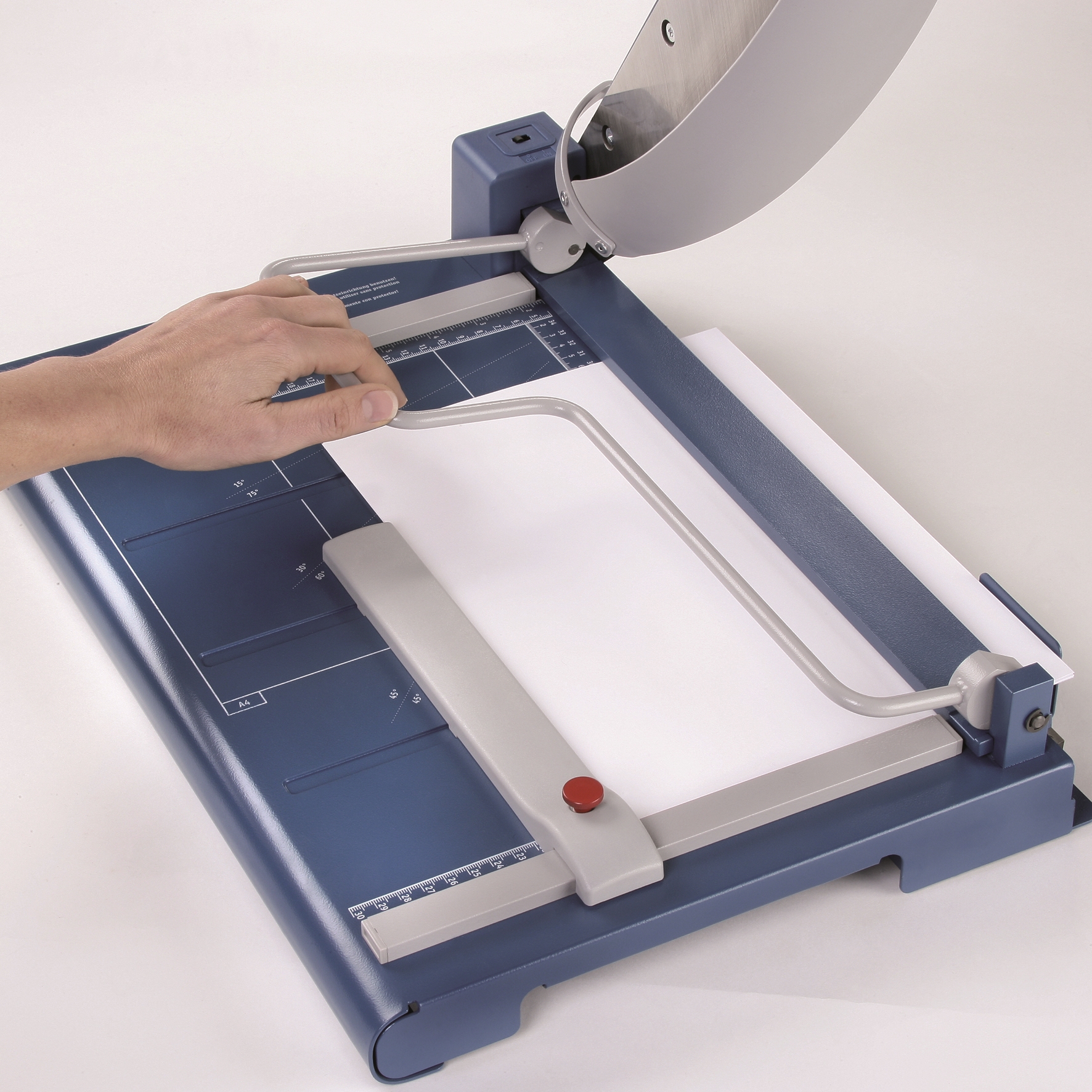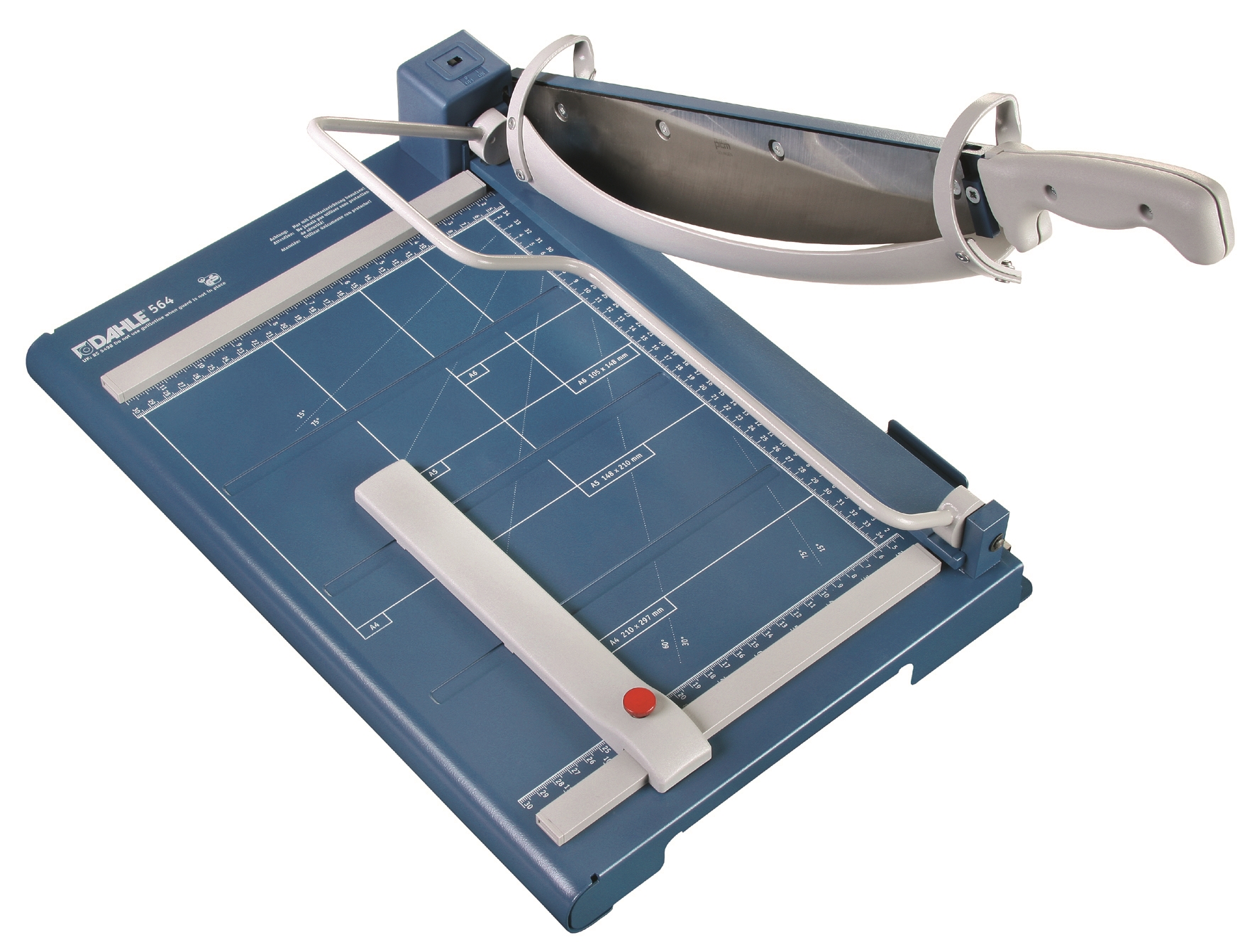 • Dahle 564 är en extremt användarvänlig skärmaskin i giljotin-modell med ett robust metallbord och halkskyddade gummifötter och är perfekt för professionell användning. Denna högkvalitativa skärmaskin levereras med ett ergonomiskt format handtag på ett knivblad som kan slipas på sikt. Laserstråleindikering ingår.