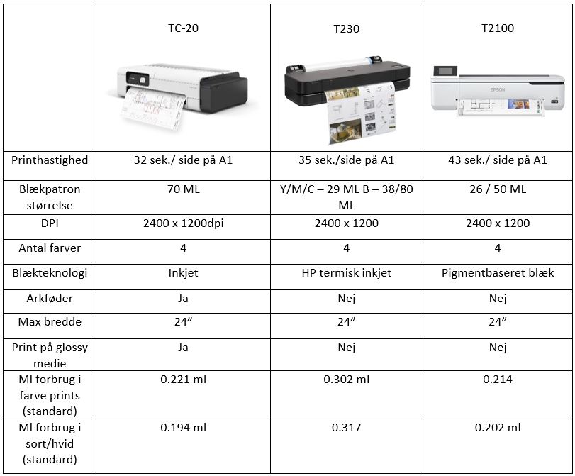 Jämförelse av Canon TC-20, Epson T2100 och HP T230