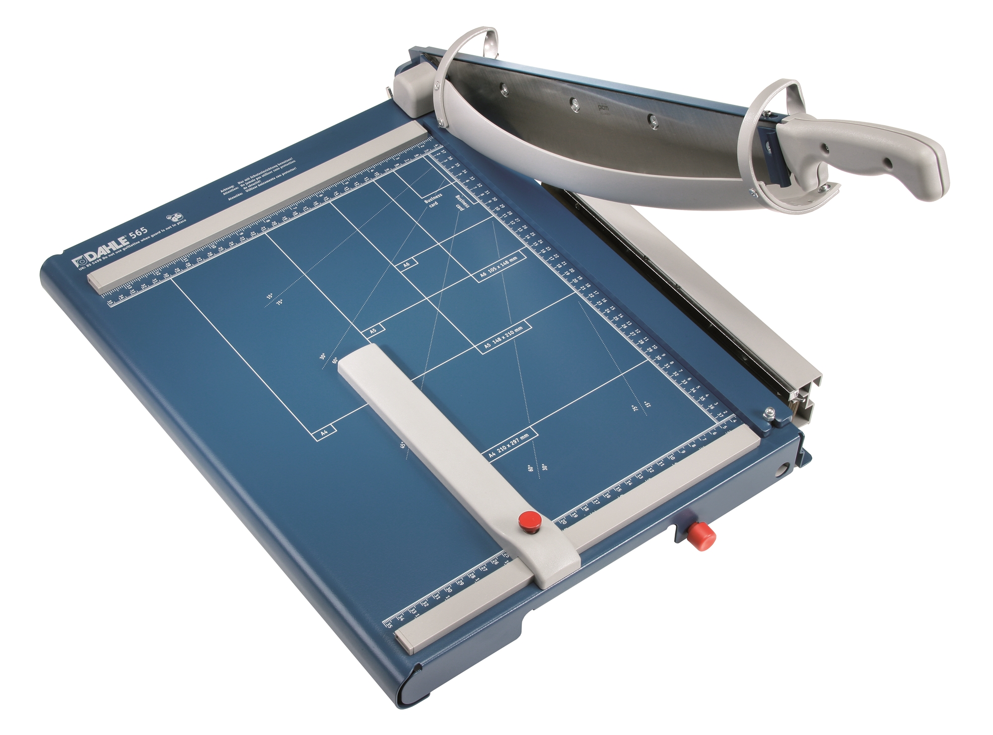 • Dahle 565 är en extremt användarvänlig giljotin med ett robust metallbord och halkfria gummifötter, vilket är perfekt för professionellt bruk. Denna skärmaskin av hög kvalitet levereras med ett ergonomiskt format handtag på ett blad som är möjligt att slipa i längden.