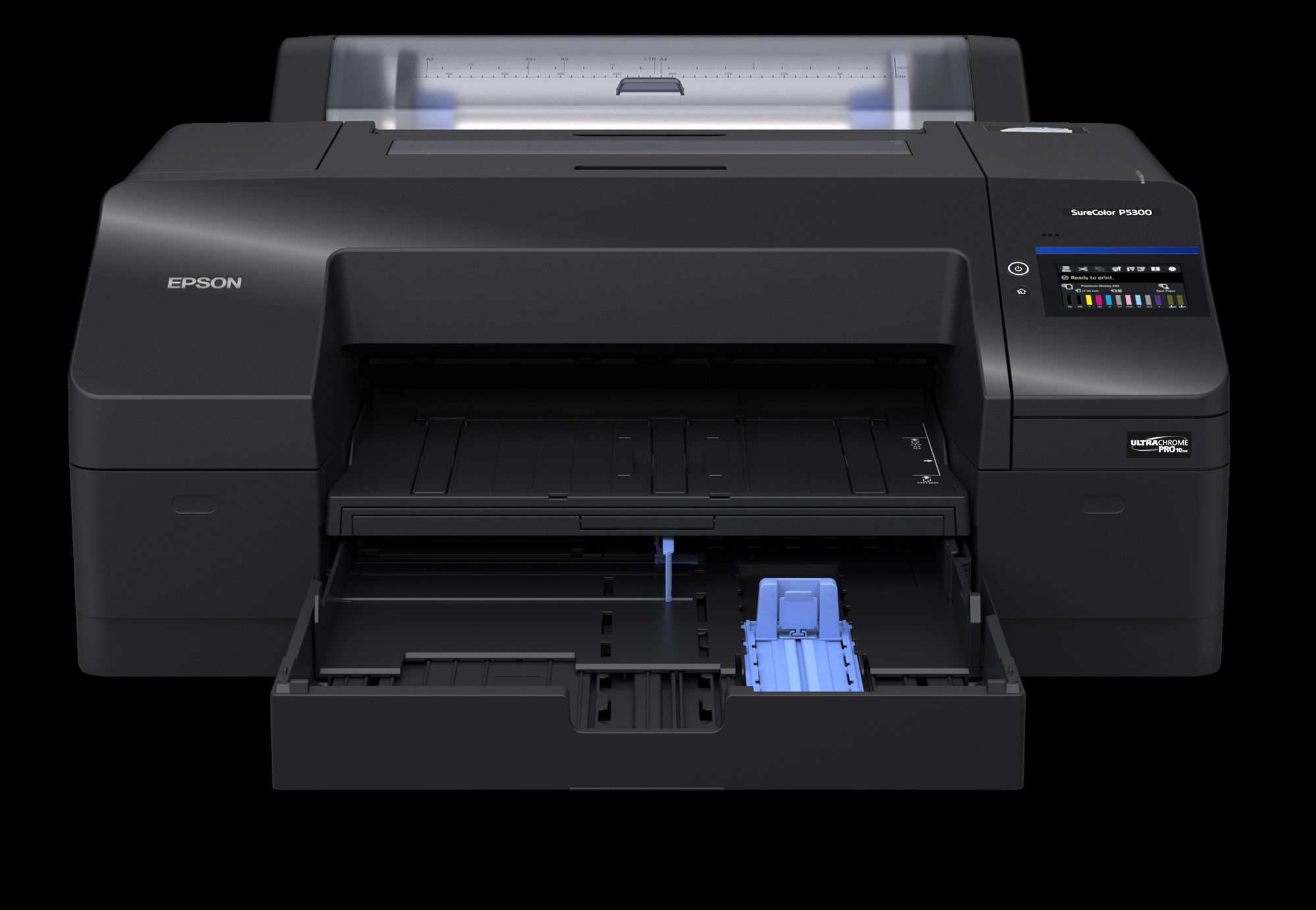 SC-P5300 skriver ut upp till A2 och erbjuder djupare svarta nyanser, förbättrad kontrast och tonalitet samt minskning av bronzer-effekt i mörka områden på blanka medier. Allt detta tack vare Epsons teknologier: UltraChrome Pro10-bläck, Black Enhance Overcoat (BEO) för högre svärttäthet, bredare blå färgskala med violett bläck och Carbon Black-läge för ännu mörkare svarta nyanser.