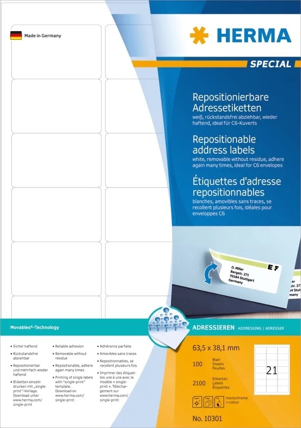 • Avtagbara etiketter på A4-ark, används på torra, släta, dammfria ytor. Kan tas bort igen utan att lämna några rester. Kan användas i bläck- och laserskrivare samt kopiatorer. 100 ark per paket. Gratis programvara tillbehör: www. herma .com/ software .