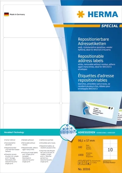 • Avtagbara etiketter på A4-ark, används på torra, släta, dammfria ytor. Kan tas bort igen utan att lämna några rester. Kan användas i bläck- och laserskrivare samt kopiatorer. 100 ark per paket. Gratis programvara tillbehör: www. herma .com/ software .