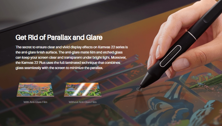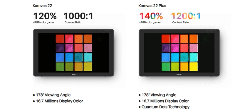 Det 120% sRGB färgomfånget gör att din Kamvas 22 bättre kan återge de färger som används i dina verk. Inte nog med det, vi erbjuder även ett annat alternativ för dig —— ett fantastiskt 140% sRGB färgomfång på Kamvas 22 Plus, vilket levereras av Quantum Dots Technology för att avslöja en mer livfull färg.