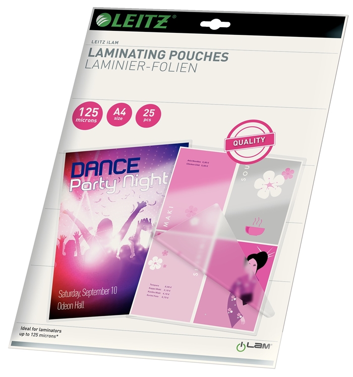 • Leitz lamineringsfickor A4 125 my. Långtidsskydd af dokument mot smuts, vätskor och fukt, stark kvalitet. Blank finish för vackra färger. 216 x 303 mm (för A4). 1 paket med 25 st. Perfekt för alla lamineringsmaskiner.