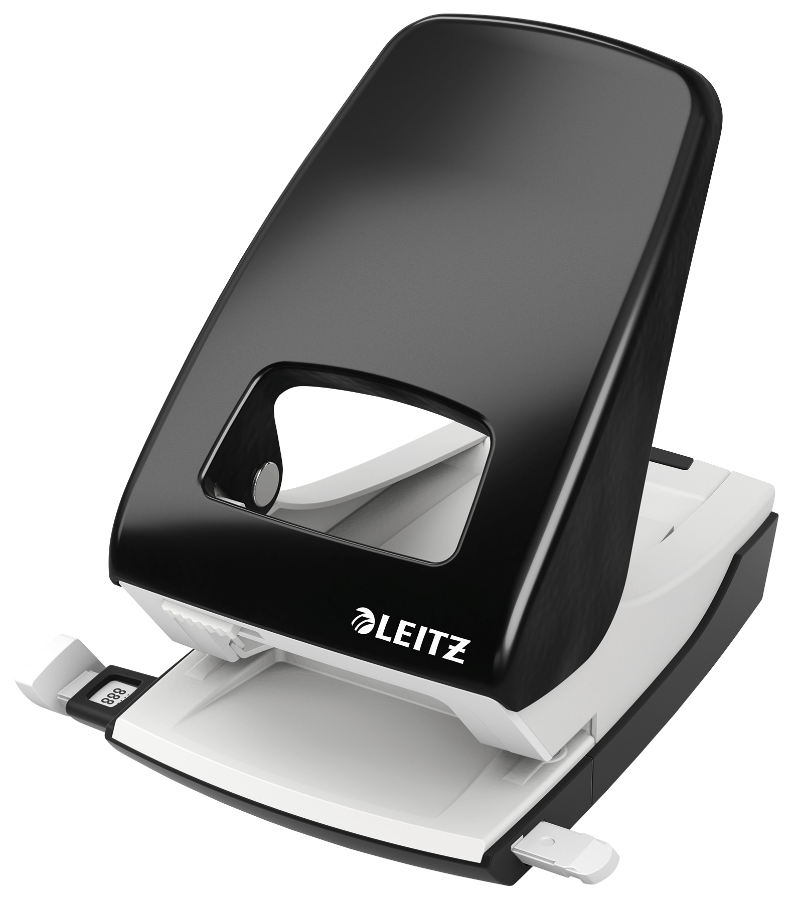 • Puncher Leitz 5138, 2-håls 40 ark, metall, svart Kraftfull stansare för stora mängder papper. Patenterad greppzon och ultraskarpa stansspetsar minskar användningen av kraft vid stansning. - Stansar upp till 40 pappersark (80 g) - Greppzon och skarpare hålslag minskar kraftanvändningen vid stansning - Tydliga pappersformatindikationer och stark pappersguide säkerställer att papperet placeras exakt - Lätt att tömma, gångjärnsförsedd behållare af samlar pappershålsmaterial - Unik låsmekanism på handtag ger kompakt förvaring i t.ex. lådan - 10 års garanti och GS säkerhetstestad