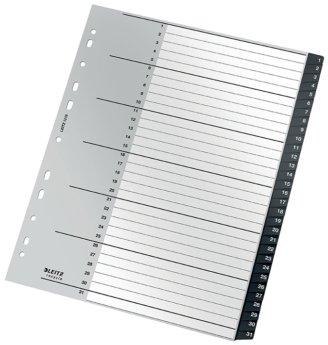 • Extra brett A4-register i premiumkvalitet, 1-31 numeriska flikar. 90 % återvunnen plast, klimatneutral och 100 % återvinningsbar. För tydlig organisation af A4-dokument, hjälper till att hålla reda på viktiga anteckningar eller skolarbete; för användning hemma, i skolan eller på kontoret. Detta robusta register kompletterar andra produkter från Leitz Recycle-sortimentet perfekt och är byggt för att hålla. Moderna och snygga gröna kontorsmaterial som passar på kontoret och hemma. Med den nya miljövänliga Recycle-serien från Leitz kan du både göra något bra för din kontorsmiljö – och miljön på vår planet. - Tillverkad af 90 % återvunnen plast, 100 % återvinningsbar och klimatneutral - För tydlig organisation af A4-dokument - 31 flikar tryckta 1-31 för snabb dokumentåtkomst - Täcker inte flikar när de används med fickor tack vare extra brett A4 maxi-format - Hållbar 160g 100 % återvunnen kartongyta med gott om utrymme för att af innehållet - 11 hål universalpassform för enkel arkivering