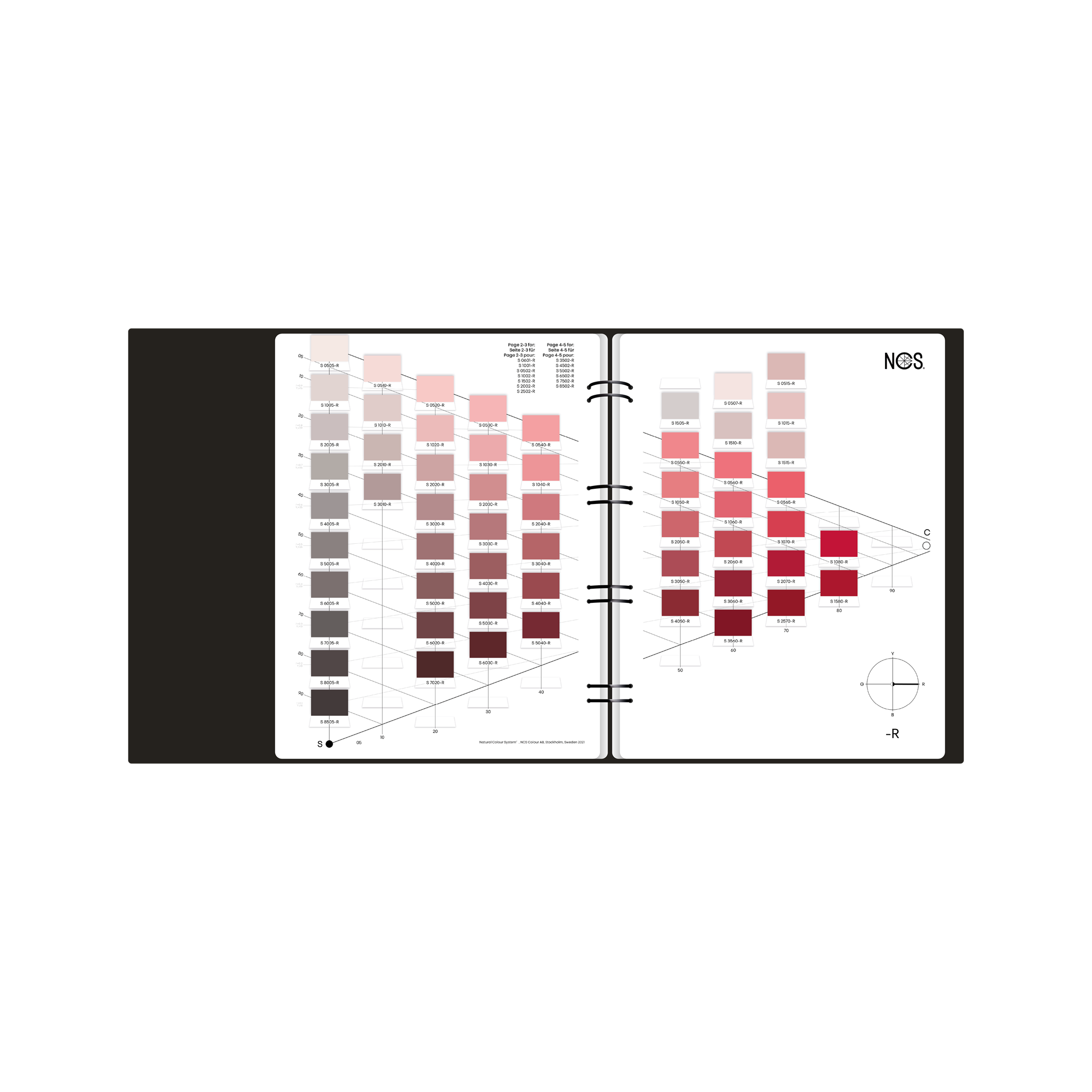 Each NCS 2050 Standard Colour is represented by colour samples that can be detached for comparison or used in mood boards etc., positioned in the NCS Album based on its relationship to the colours in nuance and hue.