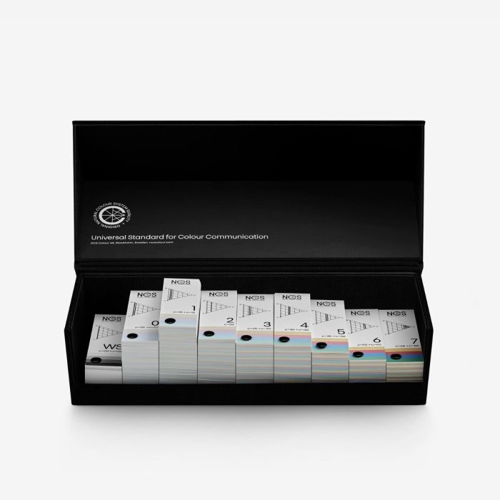 The NCS Block set is arranged by nuance, has one block for colours with 10% blackness, one for 20% blackness and in ongoing increments.