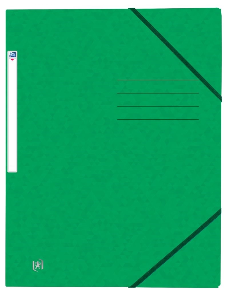 • OXFORD Top File+ samlingsmapp med elastiska band och 3 flikar. Tillverkad af 390 g/m² Multi'Strat-skiva. Multi'Strat-teknologin ger hög rivstyrka och motståndskraft mot daglig användning tack vare den exklusiva flerskiktspappen. OXFORD Top File+ samlingsmapp har en unik och modern design med ett tryckt skrivfält på framsidan för enkel att hitta och anpassa. Tre flikar och resår garanterar säker stängning och förvaring af alla viktiga dokument. För A4-dokument. Grön.