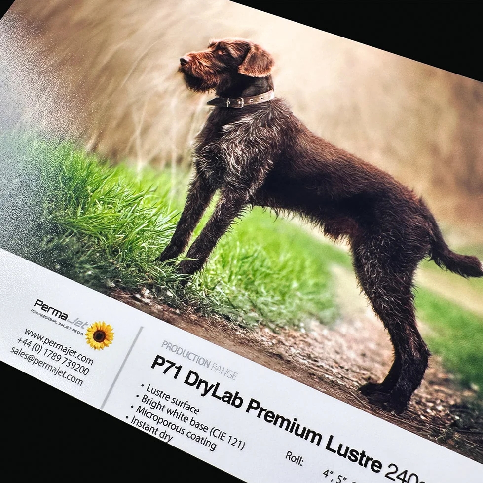 • PermaJet P71 Premium Lustre Drylab 240 är ett professionellt bläckstrålepapper för Drylab- och minilab-skrivare som Noritsu och Fuji. Med en elegant satin/lustre-ytfinish och en ljusvit bas är det det perfekta valet för dem som önskar en sofistikerad fotofinish utan reflektionerna från högblankt papper.
