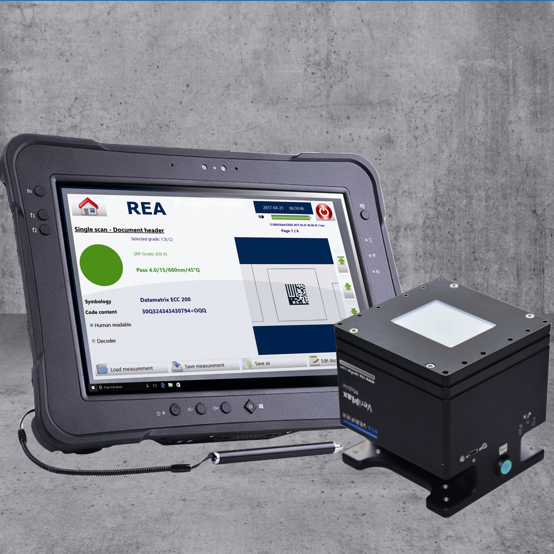 REA VeriMax Mobile är därför idealisk för att mäta stickprov. De korrekta och reproducerbara mätresultaten och kvalitetsbedömningarna minskar i slutändan fel och minskar kostnaderna. Det beror på att resultaten av mätningen fungerar som underlag för att optimera kodernas utskriftskvalitet. De uppmätta värdena i sig kan läsas och hanteras av mjukvaruapplikationen REA VeriMax Mobile, som är pekskärmsoptimerad.
