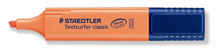 • Markeringspenna Textsurfer Classic för markering på papper, fax, bläckstråleutskrifter och kopior. Inkjet Safe ink ser till att bläckstråleutskrifter och handskrivna texter inte smutsas ut genom en enkel överstrykning. Snabbtorkande. Vrid lock för enkel öppning. Ultramjuk bred spets ca. 1 - 5 mm. Påfyllningsbar. Orange . Gjord i Tyskland