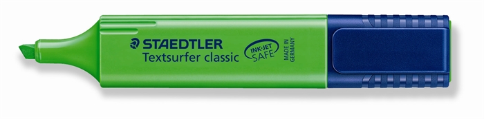 • Markeringspenna Textsurfer Classic för markering på papper, fax, bläckstråleutskrifter och kopior. Inkjet Safe ink ser till att bläckstråleutskrifter och handskrivna texter inte smutsas ut genom en enkel överstrykning. Snabbtorkande. Vrid lock för enkel öppning. Ultramjuk bred spets ca. 1 - 5 mm. Påfyllningsbar. Grön. Gjord i Tyskland